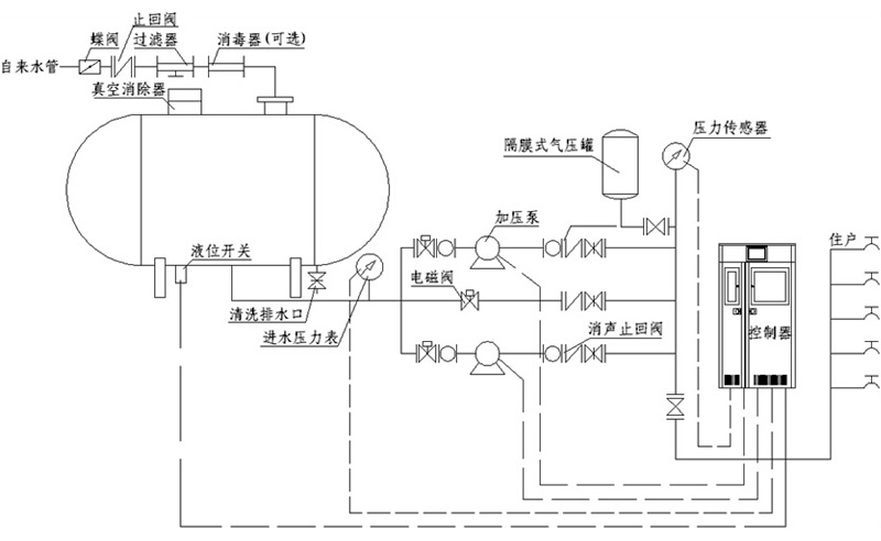 自來(lái)水管網(wǎng)與設備的穩流罐進(jìn)水口相連,出水口與用戶(hù)管網(wǎng)相連,通過(guò)控制系統設定用戶(hù)所需的供水壓力,設備自動(dòng)運行給用戶(hù)增壓供水。設備疊加市政管網(wǎng)部分壓力,通過(guò)控制系統變頻穩壓供水,用戶(hù)缺多少壓力設備補多少壓力。水泵運行時(shí),系統壓力信號由壓力傳感器反饋給變頻控制器,并根據用水量的大小自動(dòng)調節轉速達到恒壓供水。
