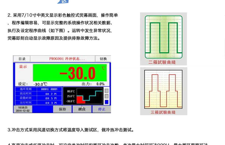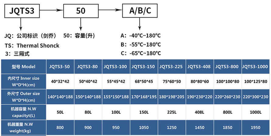 產品型號:JQTS3-408 品牌:劍 喬 用途:用途:三箱式冷熱沖擊試驗箱又名溫度沖擊試驗或高低溫沖擊試驗是用于考核產品對周圍環境溫度急劇變化的適應性,裝備設計定型的鑒定試驗和批產階段的例行試驗中不可缺少的試驗