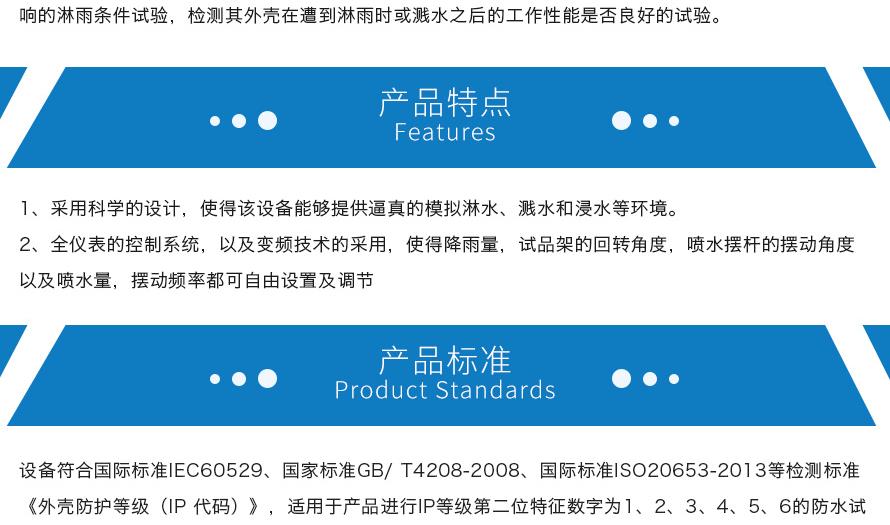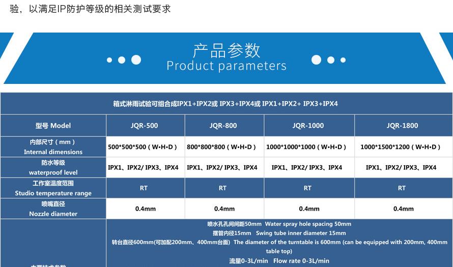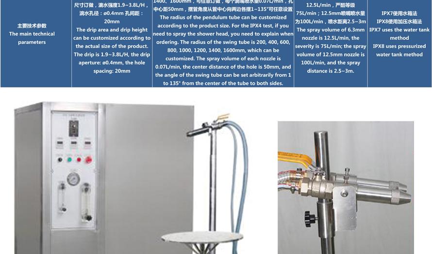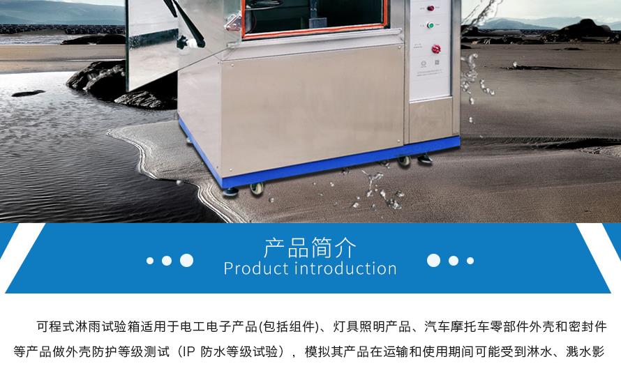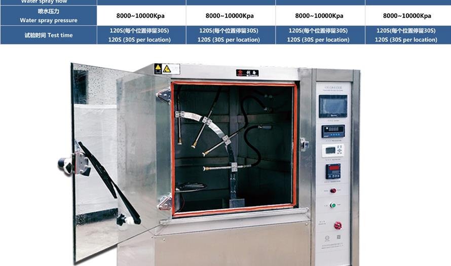 產品型號:IPX-1234 品牌:劍 喬 用途:可程式淋雨試驗箱適用于電工電子產品(包括組件)、燈具照明產品、汽車摩托車零部件外殼和密封件等產品做外殼防護等級測試(IP 防水等級試驗)